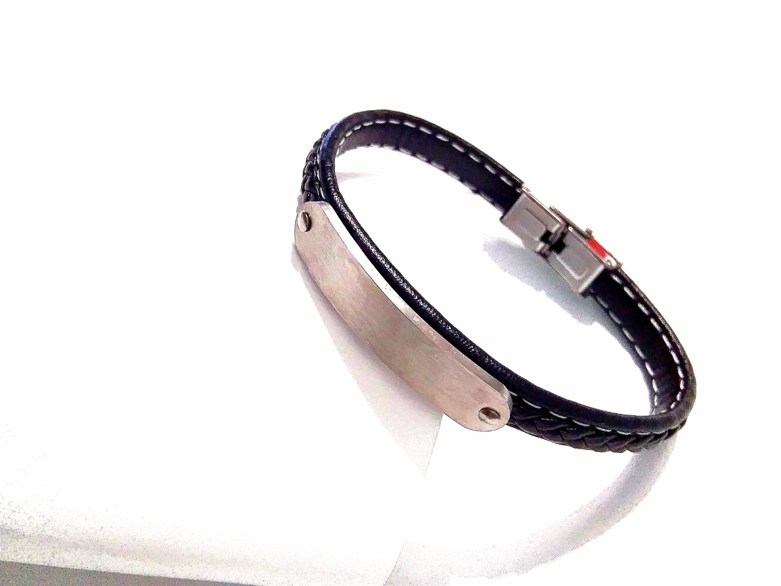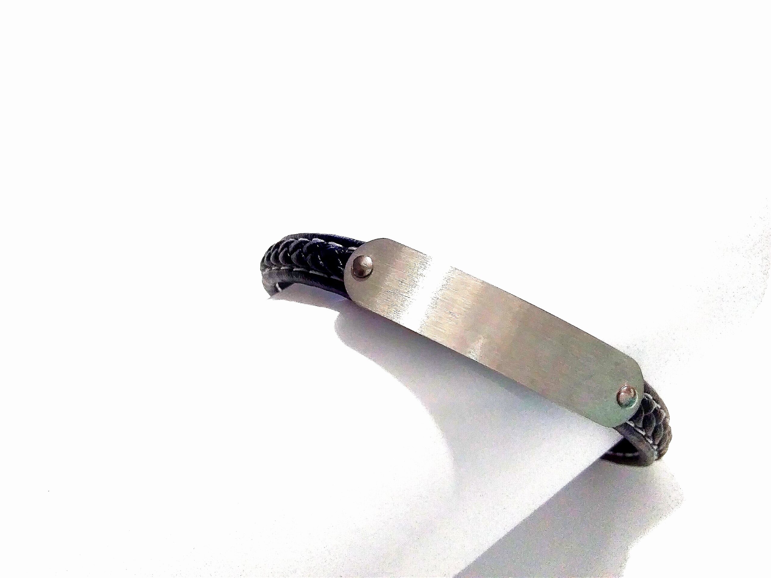 PULSERA CUERO TRENZADO Y PLACA SOBREPUESTA EN EL CUERO Y OPCIÓN DE GRABAR. CIERRE EN ACERO